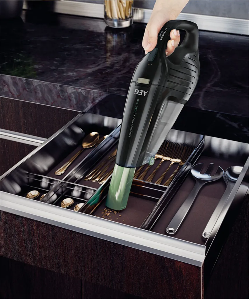 Der Handstaubsauger HX6-23ÖKO von AEG ist immer schnell zur Hand, wenn er benötigt wird. mit seiner herausziehbaren Fugendüse lassen sich auch schwerzugängliche Stellen einfach reinigen. Der Lithium-Ionen-Akku ermöglicht eine Laufzeit von bis zu 23 Minuten. Zwei oberflächenschonende Softräder sorgen für eine optimale Wendigkeit auf allen Oberflächen ohne Schleifen und Kratzen.