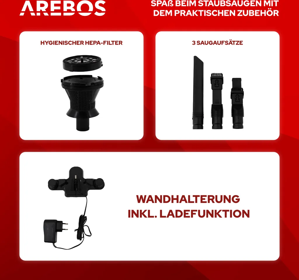 Der AREBOS Akku-Staubsauger befreit nicht nur die Bodenbeläge von Staub und Dreck: Dank der Funktion als Handstaubsauger lässt sich das Gerät enorm vielseitig einsetzen und kommt überall hin, wo es benötigt wird.