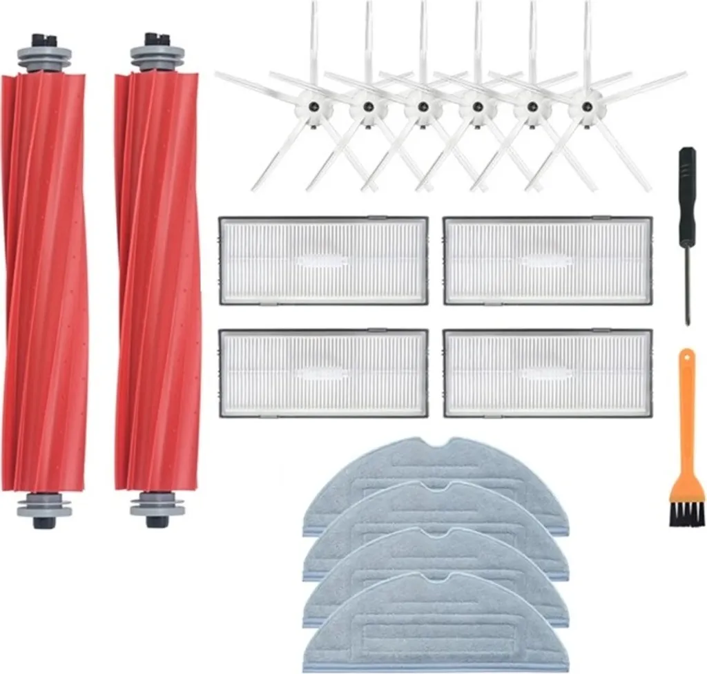 – 2 Hauptbürsten, 4 Filter, 6 Seitenbürsten, 4 Mop-Tücher, 1 Bürstenreinigungswerkzeug,1 Schraubenzieher.