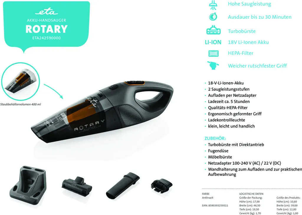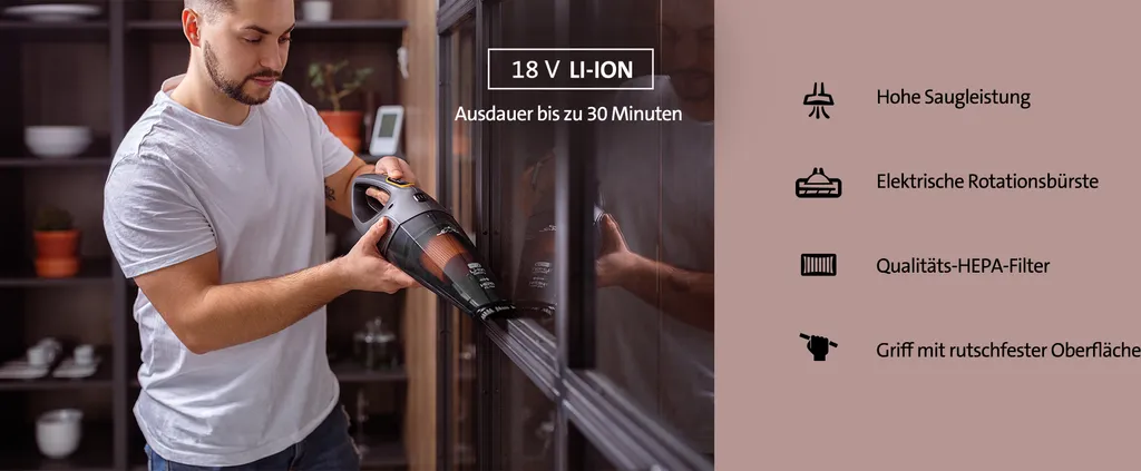 Handstaubsauger der neuen Generation mit elektrischer Rotationsbürste, hoher Saugleistung und 18 V Li-Ionen-Akku für bis zu 30 Minuten mit einer einzigen Ladung