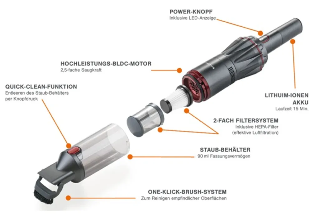 - One-Klick-Brush-System: Mit einem Klick von der normalen Düse zum Bürstenaufsatz für die Reinigung empfindlicher Oberflächen.