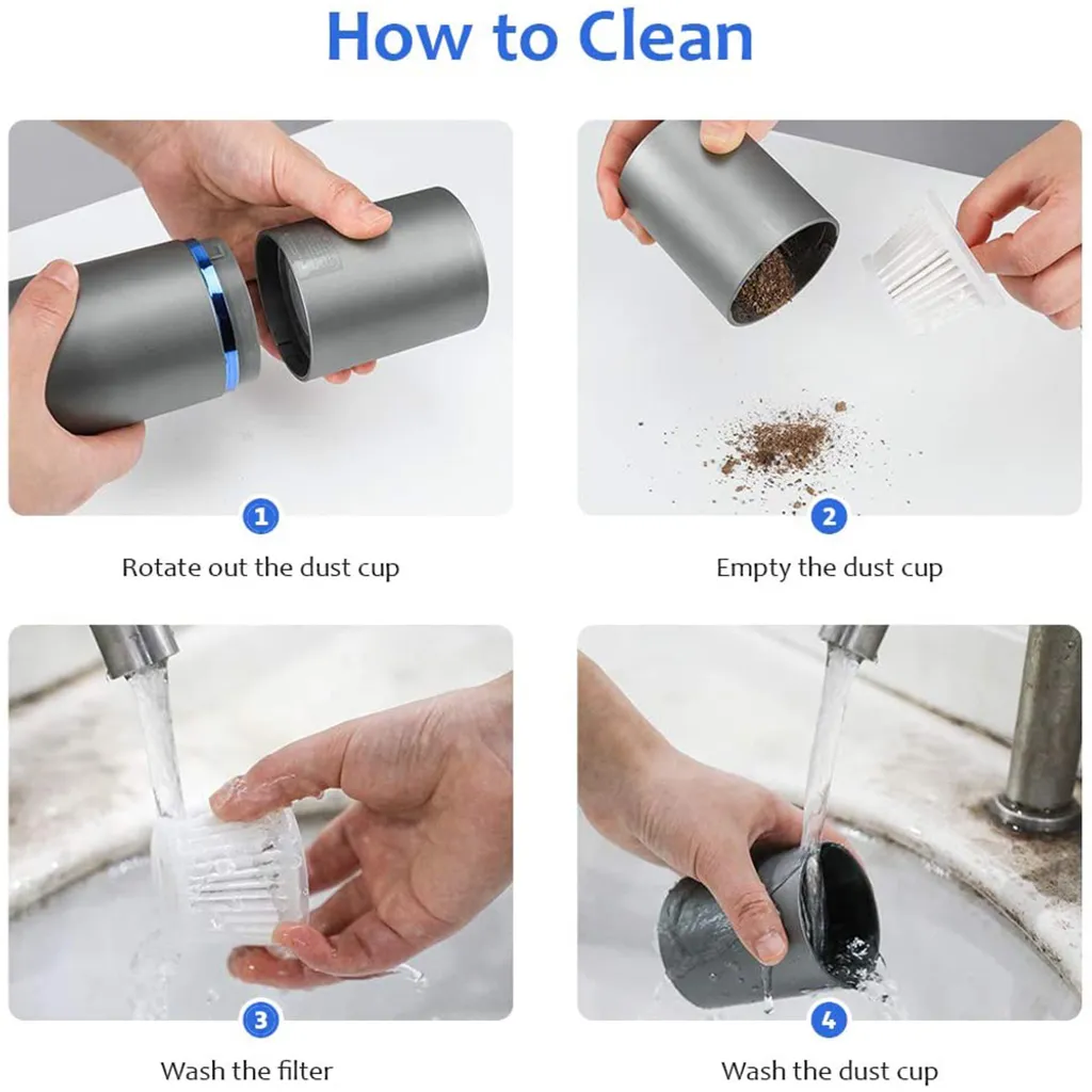 5. 【Wiederverwendbarer und waschbarer Filter】 : Der USB-Staubsauger nimmt das Staubbehälterdesign an und sein Filter entspricht dem Standard für hocheffiziente Partikelluft. Es ist leicht zu leeren, zu ersetzen und zu reinigen.