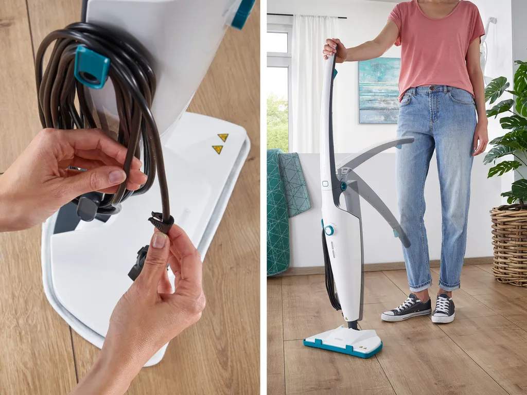 - Mit stufenloser Dampfeinstellung für optimale Feuchtigkeit auf unterschiedlichen Böden wie Stein, Fliesen, Laminat, PVC oder versiegelte Böden