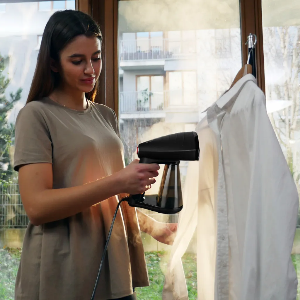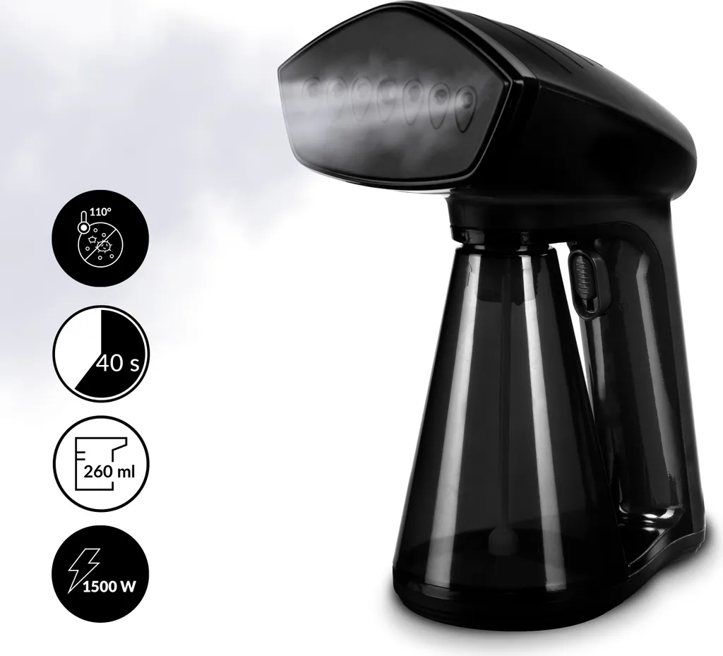 Angenehme Kleidung. Der ausschließlich auf Dampf basierende Mechanismus sorgt für effiziente Arbeit. Im Gegensatz zu herkömmlichen Bügeleisen ist es nicht möglich, die Bügelflächen zu verbrennen, eine Dampfplatte lässt sich problemlos gegen alle Arten von Materialien drücken. Das macht ihn zu einer perfekten Lösung für empfindliche Stoffe wie Seide, Baumwollmusselin, Tüll und Baumwolle. Handig ist auch für Polstermöbel geeignet. Es kann erfolgreich für Stoffe mit unterschiedlichen Dicken und Texturen verwendet werden. Bügeln und Desinfizieren in einem. Die hohe Dampftemperatur ist auch ideal für die Desinfektion. Es hilft nicht nur bei der Beseitigung von Falten, sondern eliminiert auch bis zu 99 % der Bakterien und schädlichen Mikroorganismen und Allergene, die sich auf dem Material befinden können. Totale Vielseitigkeit. Mit dem Gerät können Sie sowohl senkrecht als auch waagerecht bügeln. Ein effizienter und leistungsfähiger Mechanismus. Hohe Leistung (1500 W) zusammen mit automatischem Dauerdampf sorgen für bessere Glättung. Außerdem ist das Gerät nach 40 Sekunden betriebsbereit. Perfekt für die Reise. Die ergonomische Form, das geringe Gewicht und die kleinen Abmessungen machen ihn perfekt für den Einsatz zu Hause und auf Reisen. Bürstenkopf. Der Steamer ist mit einem abnehmbaren Bürstenbezug ausgestattet, der das Bügeln von dicken Materialien wie Jacken oder Mänteln erheblich verbessert. Abnehmbarer Wassertank mit Adapter. Ein großer Wassertank mit einem Fassungsvermögen von 260 ml ist der Komfort und die Effizienz des Bügelns. Der Dauerbetrieb dauert mehr als 8 Minuten. Der Tank kann leicht entfernt und befüllt werden. Darüber hinaus können Sie mit dem Universaladapter auch normale Flaschen als Wassertank verwenden. 2,5 m Kabel. Dank des langen Kabels bietet es einen sehr großen Arbeitsbereich. Praktische Tasche. Zum Set gehört eine praktische Tasche zur Aufbewahrung und zum Transport des Geräts.